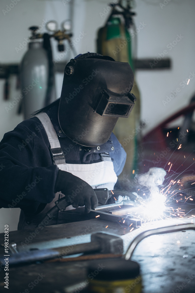 Strong And Worthy Woman Welder Doing Hard Job In Car And Motorcycle Repair Shop She Using Welding Machine To Fix Some Metal Bike Parts Stock Photo Adobe Stock